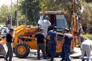 "I was driving on the main road when the [bulldozer] hit me in the rear, on the right-hand side," driver Avi Levi told Ha’aretz. "After I passed him he turned round, made a U-turn and rammed the windows twice with the shovel. The third time he aimed for my head, he came up to my window and I swerved to the right, otherwise I would have gone to meet my maker."