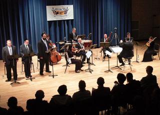 The Milwaukee Jewish arts organization RUACH performed a Jewish adaptation of the Igor Stravinsky-C. F. Ramuz work “L’Histoire du Soldat” on May 19 at the Milwaukee Youth Arts Center. Shown are the performers (from left): narrator/actors Yaakov Connor, text and story adapter David Becker and RUACH executive director Joshua Richman; ensemble members Owen Levine, Jeanyi Kim, Thomas Wetzel, William Helmers, Ted Soluri, Don Sipe and Megumi Kanda; and conductor Alexander Mandl. Photo by Leon Cohen.