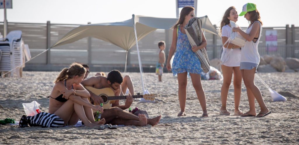 Israelis enjoying the warm weather on the beach in Tel Aviv, Oct. 3, 2016. Photo by Nati Shohat/Flash90.