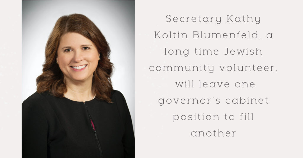 Secretary Kathy Koltin Blumenfeld, a long time Jewish community volunteer, will leave one governor’s cabinet position to fill another.