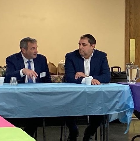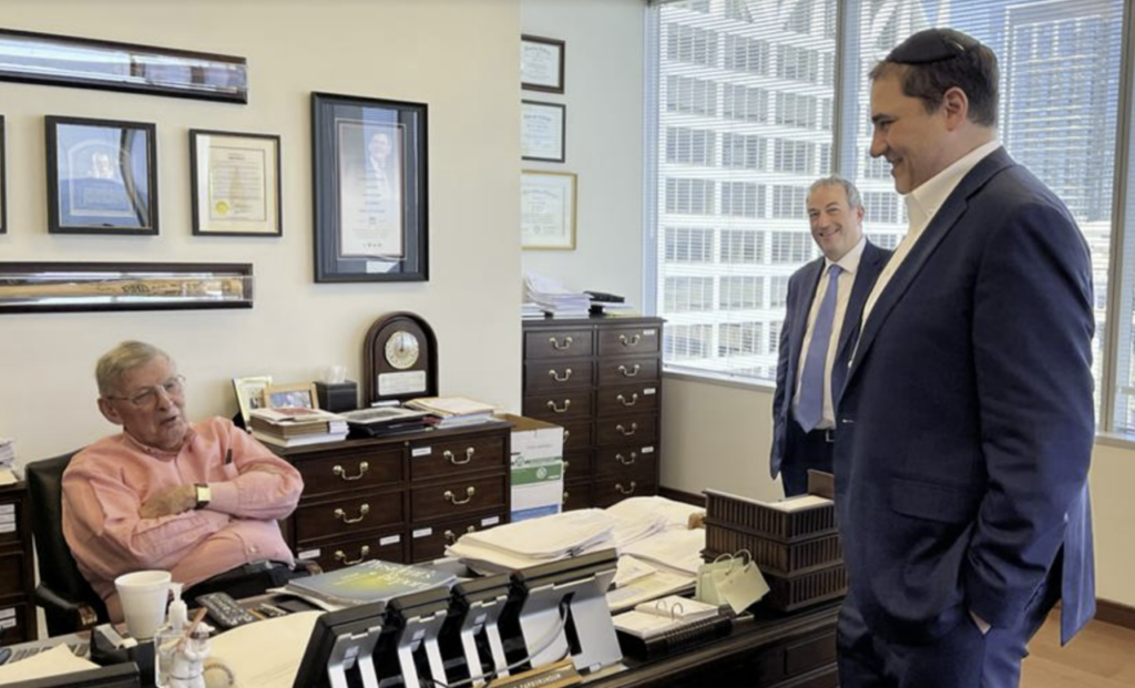 Yeshiva University President Ari Berman and Rabbi Wes Kalmar of Anshe Sfard Kehillat Torah synagogue meet with former commissioner of baseball Bud Selig, in August 2022.