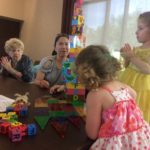 The intergenerational playgroup, held at Ovation Chai Point, 1400 N. Prospect Ave., Milwaukee, takes place on the first Sunday of each month. In June, resident Elaine Hornik and a caregiver met with Aria, in yellow, and Nora, in pink. Submitted photo.